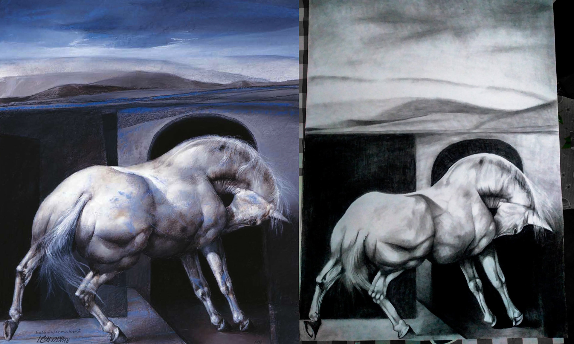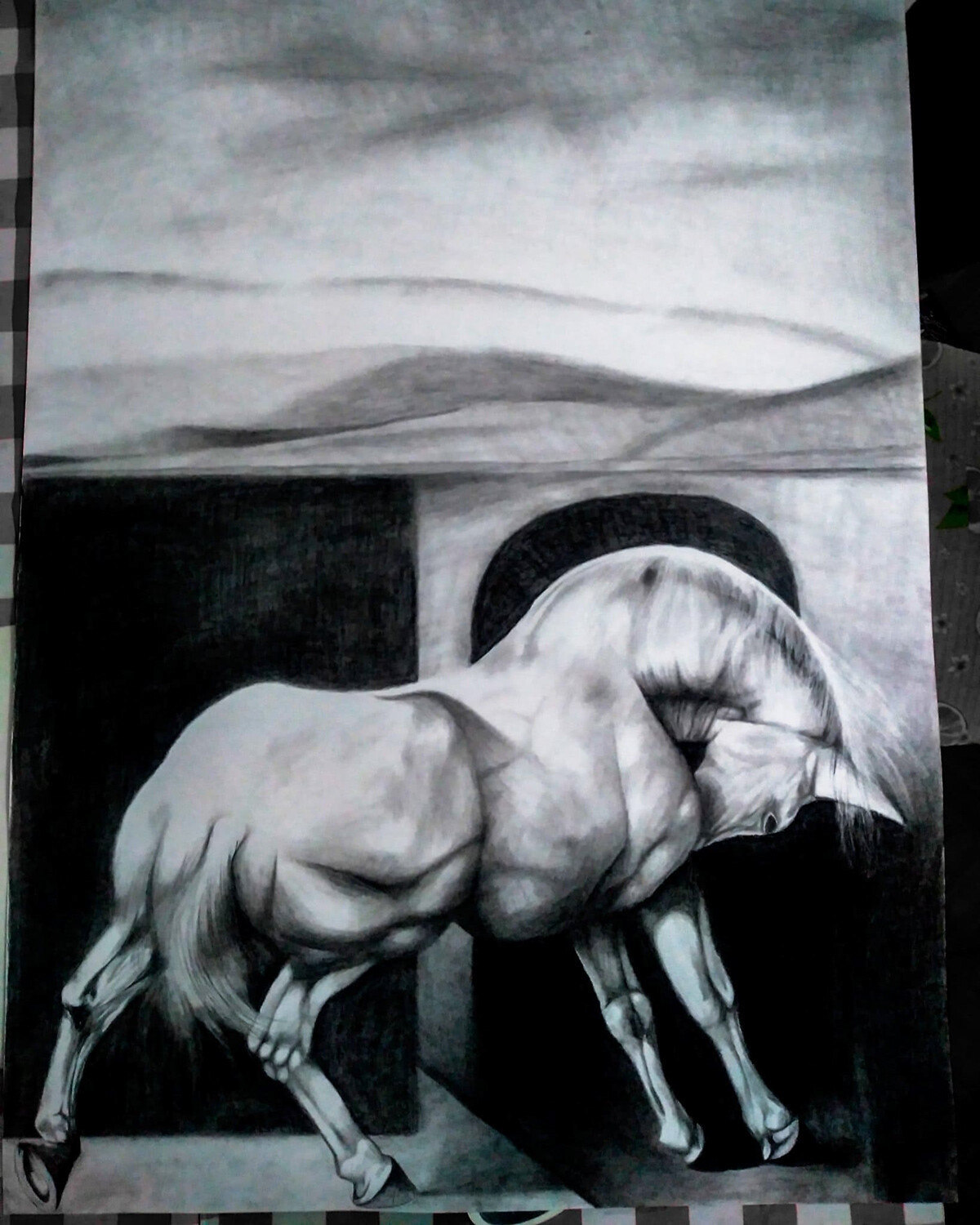 Imitación de la obra de David Manzur "Bucéfalo Atrapado en un Laberinto" (1998) en carboncillo sobre 100 cm x 70 cm.